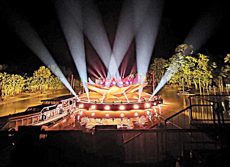 O palco do show será um espetáculo à parte: flutuante, em formato de vitória-régia, pesa mais de 13 toneladas e foi desenvolvido para ter baixo impacto ambiental. O projeto inovador une tecnologia e sustentabilidade, já que foi montado em uma área do Rio Guamá com correnteza reduzida, garantindo segurança e visibilidade para o público. As pétalas que formam o cenário lembram a imponência e delicadeza da planta símbolo da Amazônia, unindo natureza e cultura em um só gesto.