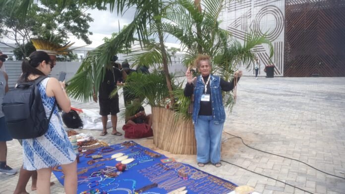 Nesta quarta-feira, 12, terceiro dia da COP30, a reportagem encontrou na área de acesso à Blue Zone, um grupo de artesãos indígenas da tribo Xikrin. Eles habitam uma aldeia em Parauapebas e aproveitam este momento único para exporem sua arte ao livre.