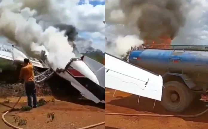 Avião de pequeno porte transportando políticos faz pouso forçado e pega fogo em Rondônia. Não há vítimas.