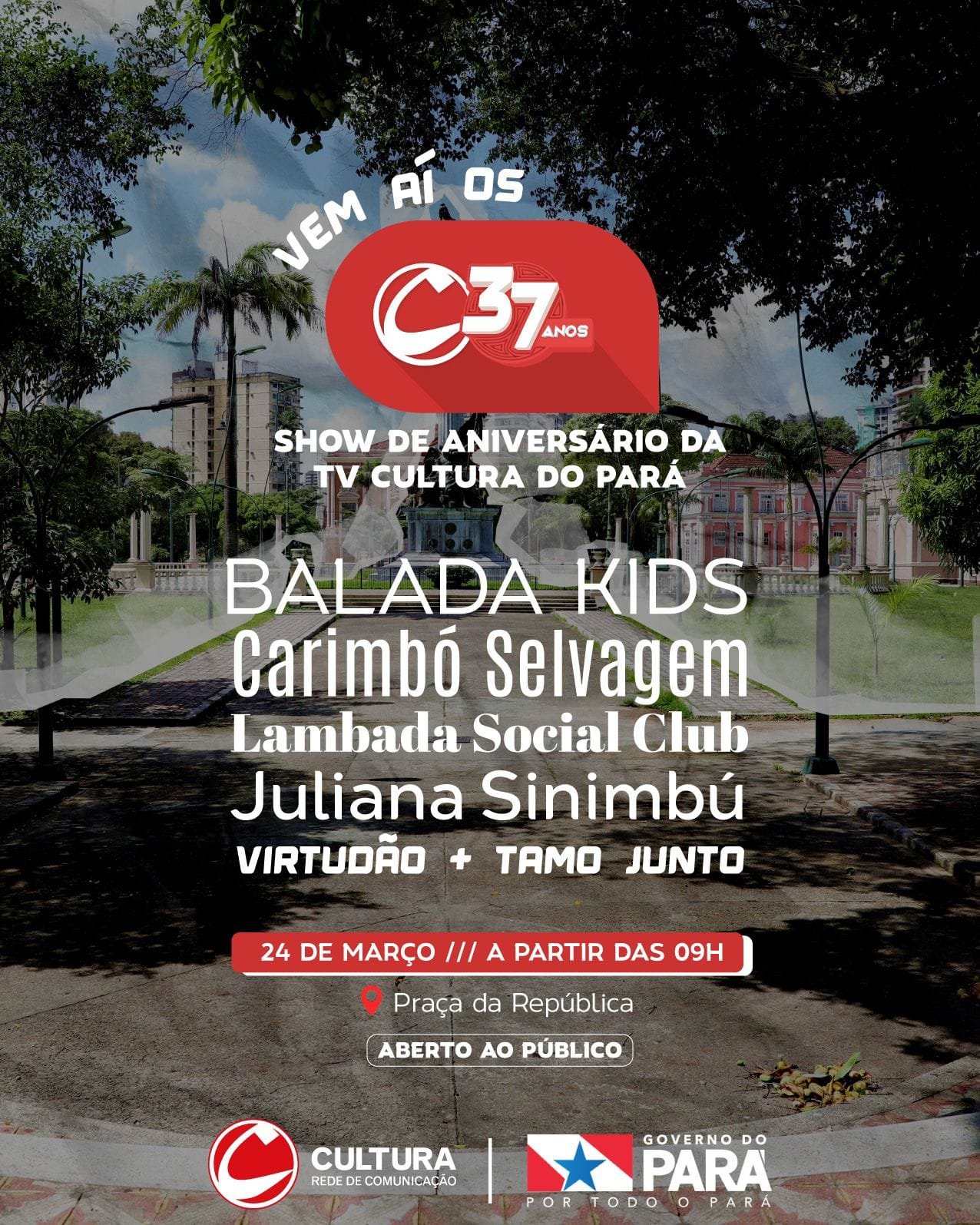 Neste domingo, 24, a partir das 9h, a Praça da República será palco de um show mais do que especial. No palco estarão se apresentando o Balada Kids, o Grupo Carimbó Selvagem e a cantora Juliana Sinimbu. As apresentações fazem parte do calendário de aniversário de 37 anos da TV Cultura e também do grupo de carimbo surgido na área do Ver-o-Peso.