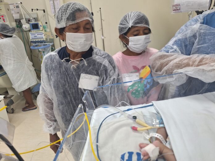 A pequena Naiana Alves de Sousa talvez nem saiba, mas foi paparicada e cuidada pelos avós maternos, Geraldo de Sousa Silva e Lucenilda Alves Silva, bem de pertinho. A bebê recém-nascida esteve internada na Unidade de Terapia Intensiva do Hospital Regional do Baixo Amazonas Dr. Waldemar Penna (HRBA), em Santarém, no Oeste paraense, em tratamento por uma má formação no estômago. A família participou do projeto “Visita dos Avós”, promovido pela unidade de saúde.