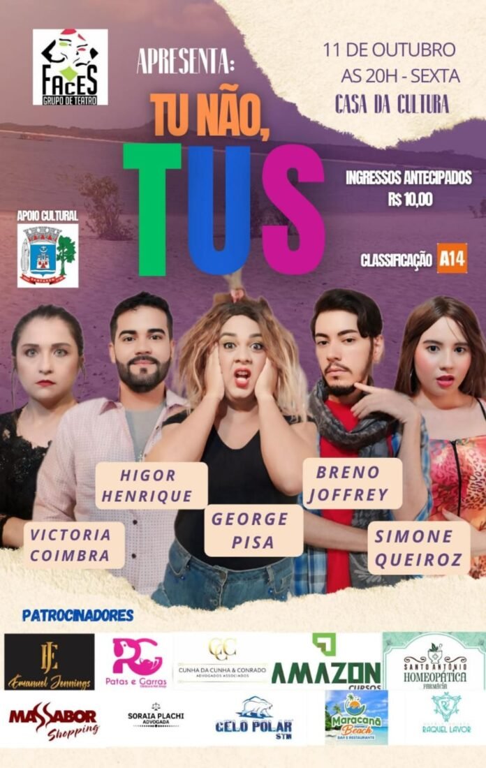 A estreia do novo projeto teatral do Grupo Faces será na Casa da Cultura. Trata-se do espetáculo no gênero comédia “Tu não, Tus” no dia 11 de outubro, a partir das 20 horas. São 13 pessoas envolvidas na peça, cinco no palco e oito nos bastidores. A classificação indicativa é de 14 anos. Ingressos antecipados: R$ 10,00 e na data do evento R$ 20,00. O apoio institucional é da Prefeitura de Santarém/Secretaria Municipal de Cultura (Semc).