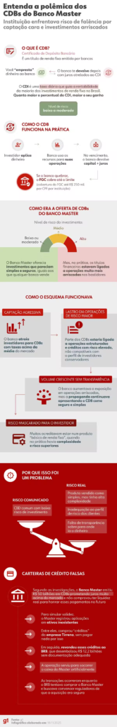 - O Banco Master emitiu R$ 50 bilhões em certificados de depósito bancário (CDBs) prometendo juros acima das taxas de mercado e sem comprovar que tinha liquidez, ou seja, que conseguiria pagar esses títulos no futuro.