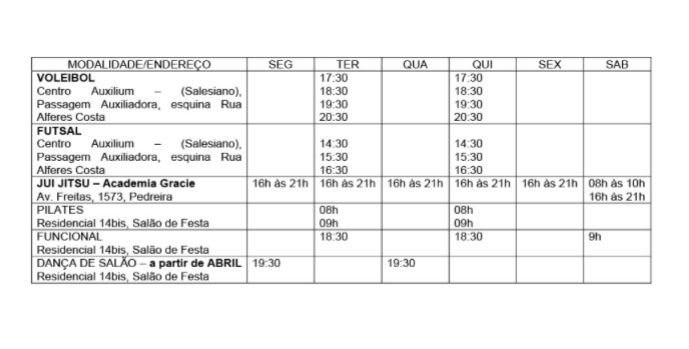 O voleibol é realizado às terças e quartas-feiras, nos horários de 17h30, 18h30, 19h30 e 20h30, com orientação do professor Mário. Já o futsal acontece às terças e quintas-feiras, com turmas às 14h30, 15h40 e 16h30, sob comando do professor Felipe.