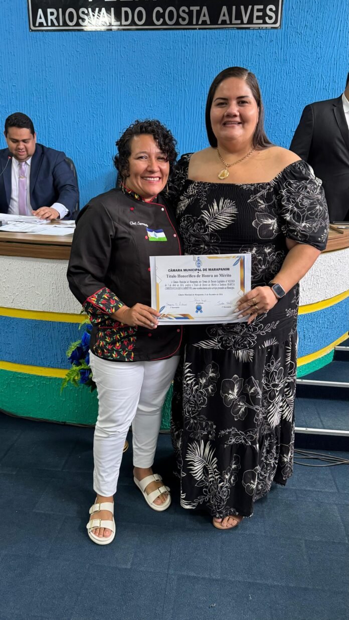 A Chef Márcia Sarmento, natural do município de Marapanim, a terra do carimbo, por sugestão da vereadora Naná Oeiras, foi agraciada com o Diploma de Honra ao Mérito por relevantes serviços prestados àquela cidade. A homenageada, que concorreu ao cargo de vereadora nas eleições de outubro deste ano, é conhecida por levar o nome de Marapanim pelo Brasil e pelo mundo por meio das especiarias que prepara, com o sabor paraoara.