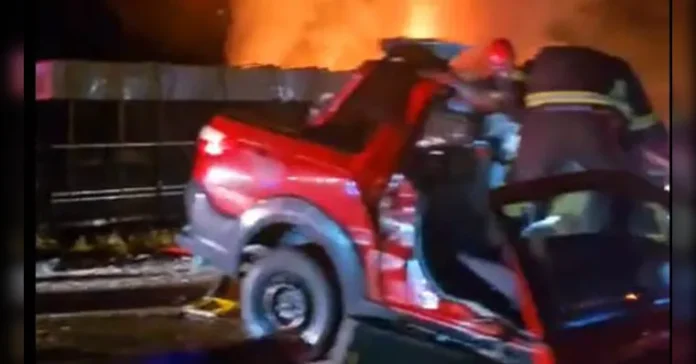 Ainda não há informações precisas sobre o que teria acontecido, certo é que a picape foi atingida pela lateral e virou um monte de ferro retorcido.