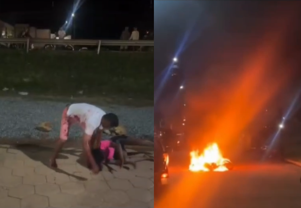 De acordo com informações que circulam nas redes sociais, o desentendimento teria começado dentro do estabelecimento após uma discussão envolvendo um casal. Durante a confusão, a motocicleta de um dos envolvidos acabou sendo incendiada.