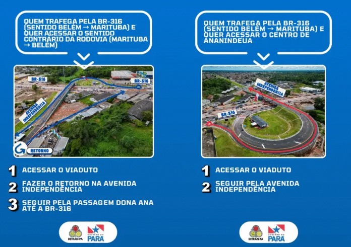 Para melhor esclarecer aos condutores sobre essa nova rota, o Detran preparou um material explicativo detalhando o trajeto e itinerário tanto para quem transita na BR no sentido Marituba e deseja acessar a avenida Independência ou retornar para Belém, quanto para quem está na avenida Independência e deseja acessar a BR ou ir para Marituba.