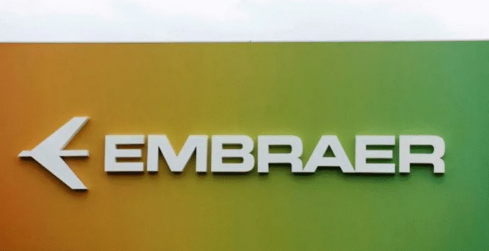 Placa com logo da Embraer • 20/07/2022REUTERS/Peter Cziborra