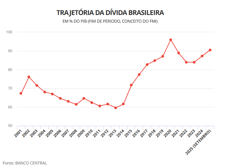➡️ No padrão do Fundo Monetário Internacional (FMI), referência para comparação internacional — que inclui títulos públicos que estão na carteira do BC no endividamento brasileiro —, a dívida do país é muito maior: 90,5% do PIB (patamar de setembro).