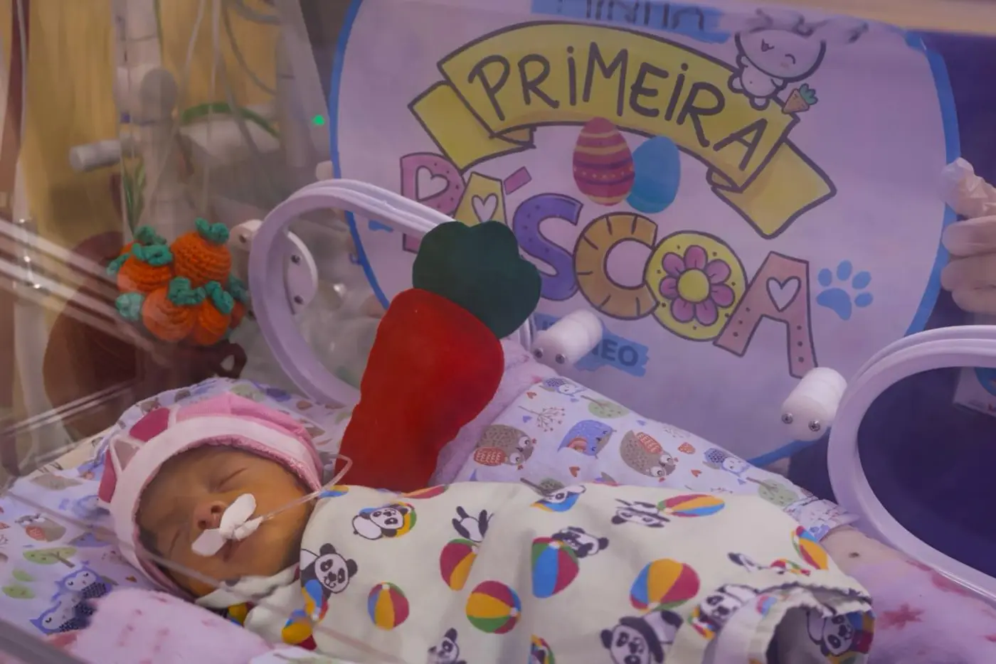 Ambientação – A ação foi realizada dentro da UTI Neonatal, respeitando a rotina da unidade. Para compor o cenário, voluntários confeccionaram adereços temáticos, como orelhinhas de coelho nas cores rosa e azul, cenouras e um painel com a mensagem “Minha primeira Páscoa”. O ensaio contou ainda com a participação voluntária da técnica em Enfermagem Cleidiane Santos, que também atua como fotógrafa.