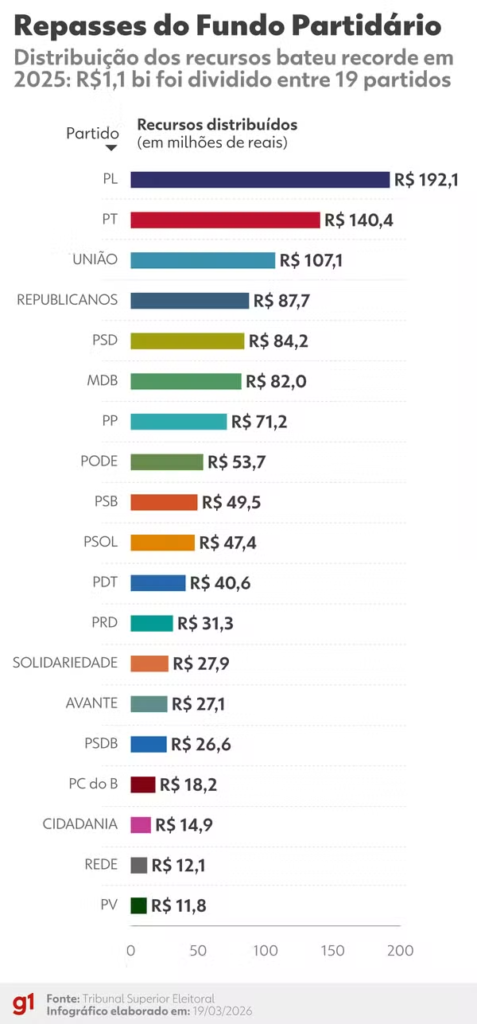 Em 2025, os repasses do Fundo Partidário bateram recorde: R$ 1,1 bilhão foram distribuídos a 19 partidos políticos. O valor representa um aumento de 2,4% em relação a 2024.