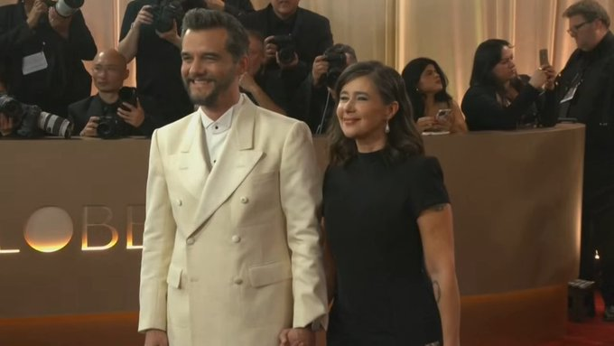 O brasileiro Wagner Moura, indicado à categoria de Melhor Ator por seu trabalho em O Agente Secreto, chegou ao Globo de Ouro 2026 vestido todo de branco e acompanhado da esposa e diretora de cinema, Sandra Delgado.