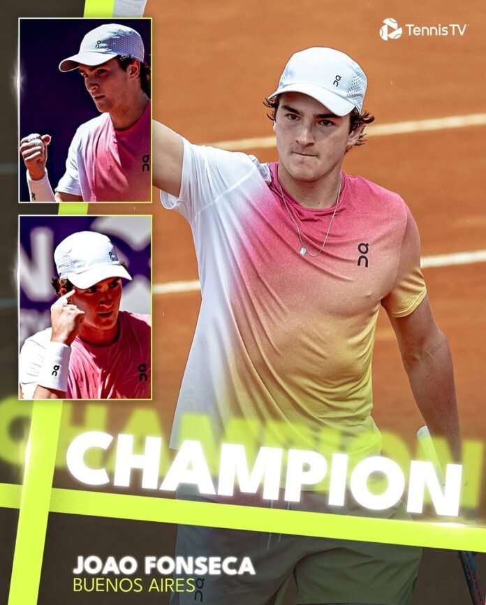 João Fonseca conquista o título do ATP 250 de Buenos Aires ao derrotar o argentino Francisco Cerundolo na final. O jovem tenista brasileiro, de apenas 18 anos, venceu a partida por 2 sets a 0, com parciais de 6/4 e 7/6 (1).