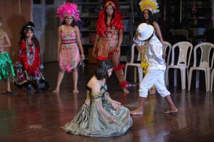 Com esse enredo de amor, intriga e traição, mas com final feliz, o Cordão de Pássaro Junino Tem-Tem, de Outeiro, apresentou a peça “A Obsessão de Narjara”, na tarde de domingo, 22, no segundo dia de apresentações do Arraial de Belém 2025 , na Biblioteca Municipal Avertano Rocha, no distrito de Icoaraci.
