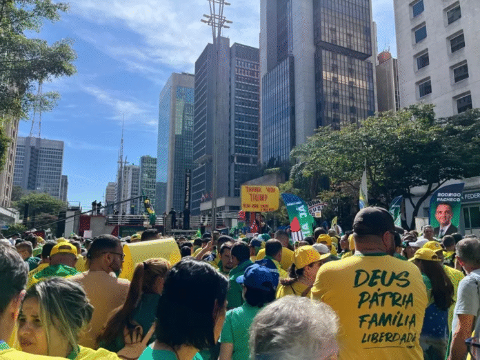 Manifestantes que participam de ato da oposição na Avenida Paulista, em São Paulo, neste domingo (3) agradecem e pedem “ajuda” ao presidente dos Estados Unidos, Donald Trump — por meio de placas e faixas.