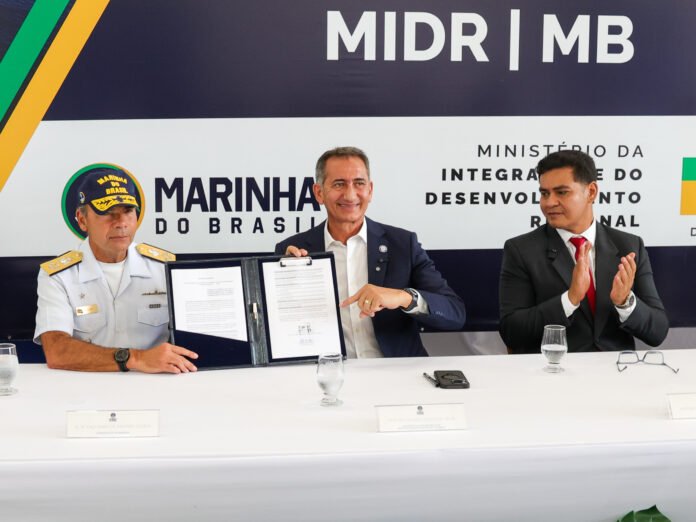 A Marinha do Brasil (MB) e o Ministério da Integração e do Desenvolvimento Regional (MIDR) assinaram, ontem, segunda-feira, 08, um protocolo de intenções para ampliar a cooperação na prevenção, no monitoramento e na resposta a desastres naturais. O evento, realizado na sede da Capitania dos Portos do Amapá, em Santana (AP), contou com a presença do ministro da Integração e do Desenvolvimento Regional Waldez Góes e do Comandante da MB, Almirante de Esquadra Marcos Sampaio Olsen. “É um documento histórico que representa um compromisso com o fortalecimento da soberania do Brasil e da integração das políticas públicas de desenvolvimento regional, de proteção e de defesa civil. Com certeza a cada dia seremos mais gigantes, com uma Marinha forte cumprindo seu papel”, destacou o ministro Waldez Góes.
