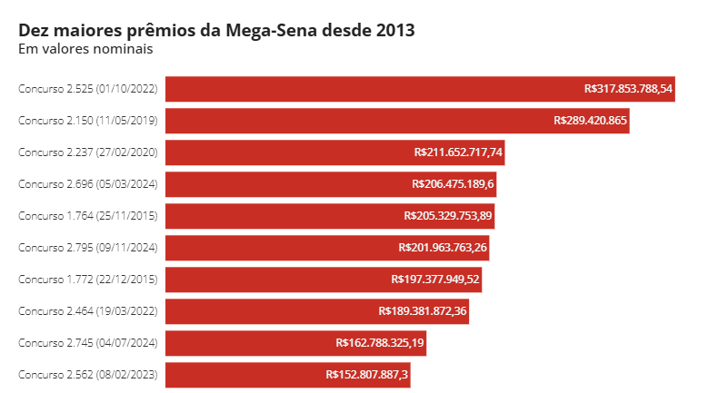Já para uma aposta com 20 dezenas (limite máximo), com o preço de R$ 232.560,00, a probabilidade de acertar o prêmio é de 1 em 1.292, ainda de acordo com a instituição.