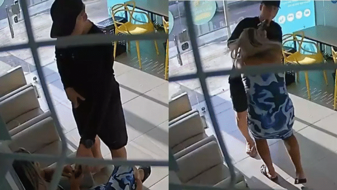 Nas imagens, a vítima aparece sentada em uma poltrona, mexendo no celular, quando um homem entra no local. Vestindo boné e roupas pretas, ele saca uma arma e exige o aparelho da mulher. Ela resiste e tenta segurar o telefone, o que faz o suspeito engatilhar a arma. Em seguida, a vítima parte para cima dele na tentativa de recuperar o celular, mas sofre uma coronhada no rosto.