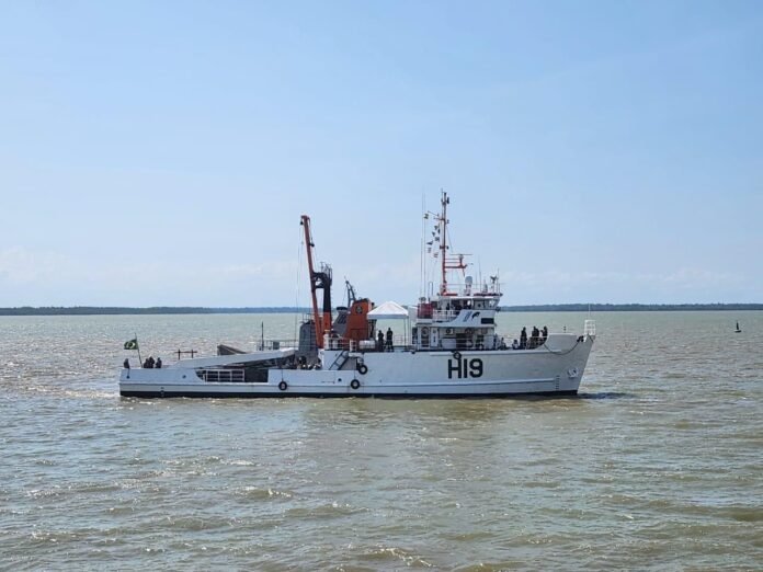 O Navio Hidrográfico Balizador Tenente Castelo, meio subordinado ao CHN-4, foi empregado na obtenção dos dados em tempo real de maré observada na Barra Norte, nos dias que antecederam a passagem do navio Royal Orion, de modo a confirmar se as condições para a realização do teste seriam satisfatórias.