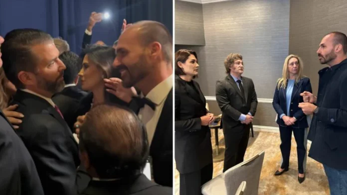 Ao divulgar os registros nas redes sociais, Eduardo fez questão de agradecer Trump Jr. por perguntar sobre seu pai, o ex-presidente Jair Bolsonaro (PL), que não pode comparecer devido à recusa do ministro Alexandre de Moraes, do Supremo Tribunal Federal (STF), em deixá-lo sair do país em meio às investigações em curso contra ele.