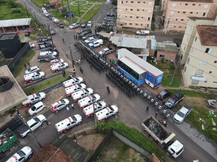 As ações coordenadas pela Secretaria de Segurança Pública e Defesa Social (Segup) junto aos órgãos de segurança estaduais e municipais de Belém, Ananindeua e Marituba, seguem com reforço de mais de 300 agentes nos bairros do Aurá, Águas Lindas, Águas Claras e comunidade do Pato Macho, para coibir e reprimir qualquer prática criminosa nesses bairros.
