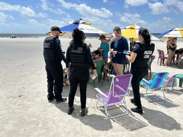 Em continuidade à Operação Verão deste ano, na manhã deste sábado, 12, equipes da Diretoria de Atendimento a Grupos Vulneráveis (DAV) realizaram, em Salinópolis, ações de panfletagem com o objetivo de conscientizar a população sobre a violência contra a mulher e reforçar a campanha ‘Não é Não’, que combate a importunação sexual.