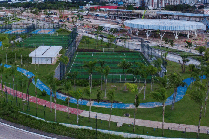 Com 88% das obras da Etapa COP30 concluídas, o parque ocupa uma área de 500 mil metros quadrados e conta com estrutura pensada para o clima amazônico, como trilhas, ciclovias, lago, quadras esportivas, museu da aviação, Centro de Economia Criativa, Centro Gastronômico e soluções sustentáveis, como placas solares, reaproveitamento de água e wetlands (áreas úmidas naturais).