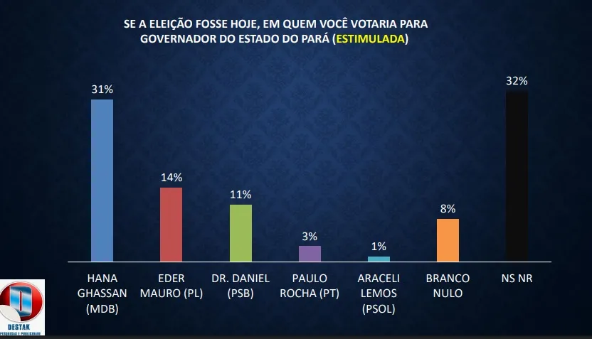 No cenário estimulado, quando os nomes dos candidatos são apresentados aos entrevistados, Hana Ghassan aparece com 31% das intenções de voto, seguida por Éder Mauro (14%) e Dr. Daniel (11%). O senador Paulo Rocha (PT) tem 3%, e Araceli Lemos (PSOL) soma 1%.