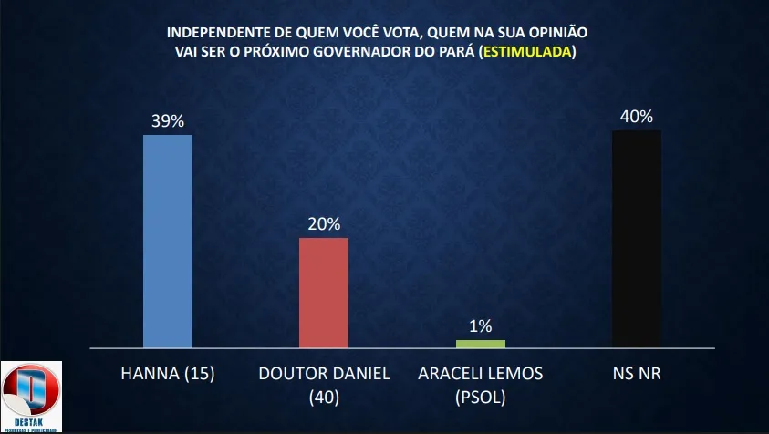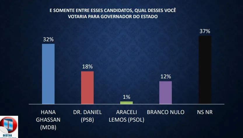 Nesse quesito, 39% apostam em Hana Ghassan como futura governadora, enquanto 20% acreditam que Dr. Daniel será o escolhido. Araceli Lemos aparece com 1%, e 40% preferiram não opinar.