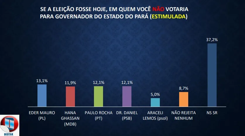 Em relação à rejeição dos candidatos, o levantamento mostra equilíbrio entre os principais nomes. Éder Mauro lidera o índice negativo com 13,1%, seguido por Paulo Rocha e Dr. Daniel, ambos com 12,1%, e Hana Ghassan logo atrás, com 11,9%.