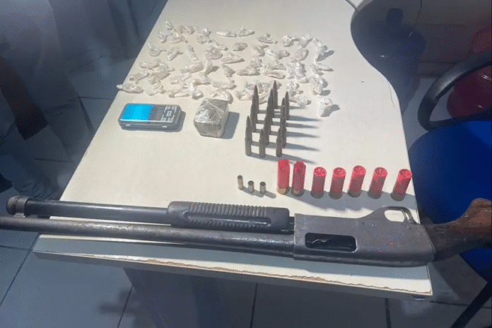 Na residência, os militares apreenderam uma espingarda industrial calibre 12, sete munições do mesmo calibre (duas deflagradas e cinco intactas), 16 munições de fuzil calibre 5.56, 54 invólucros de substância semelhante à cocaína, um tablete de aproximadamente 300 gramas de substância análoga à maconha e uma motocicleta com registro de roubo.