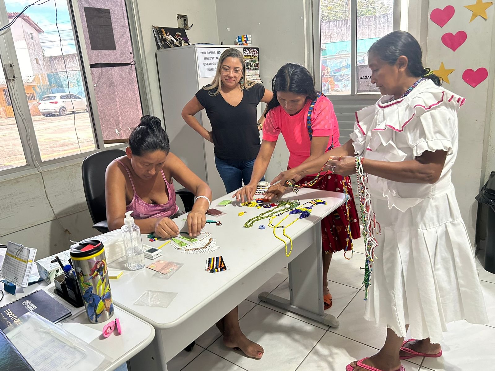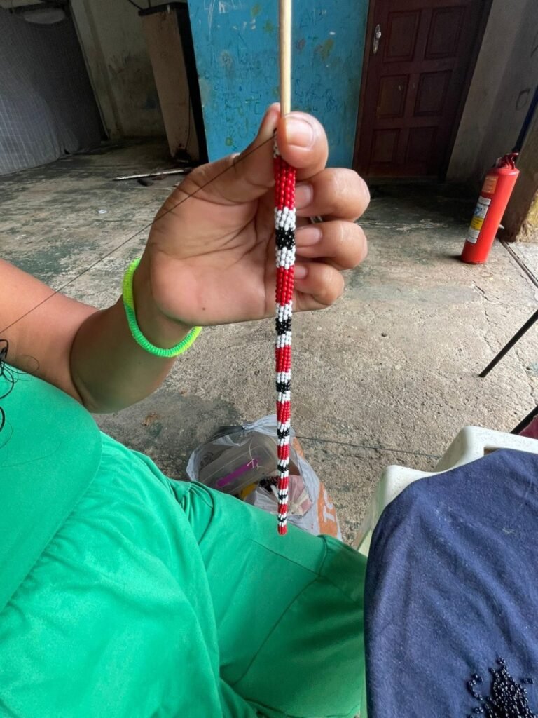 Mãos que tecem a cultura de um povo compartilham arte no espaço de lazer da Casa de Acolhimento, no bairro do Tapanã, em Belém. Ali, mulheres indígenas miçangueiras do povo Warao transformam miçangas em colares, brincos e pulseiras — peças que não são apenas adornos, mas extensões de uma memória coletiva mantida viva, mesmo longe de seu território de origem.