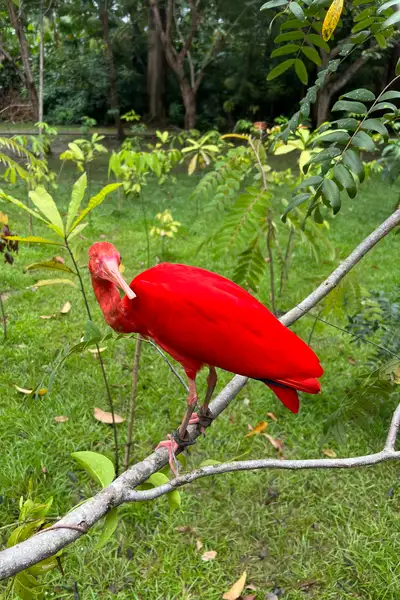 “O Demolidor (guará do parque) possui deficiência visual e nasceu aqui mesmo no Mangal, em uma ninhada de setembro de 2024. Trata-se de uma ave que vive, normalmente, em áreas de manguezal, onde realiza o forrageamento, ou seja, a busca por alimento. Esse processo acontece na lama: ela encosta o bico e o movimenta para sentir a textura e localizar pequenos organismos, como camarões e outros crustáceos. Em cativeiro, a dieta dele é adaptada com ração enriquecida para garantir a manutenção da cor vibrante. Sem a ingestão adequada dessa substância, a coloração das penas pode se tornar mais clara e opaca”, afirma a técnica ambiental do Mangal das Garças, Beatriz Tavares.