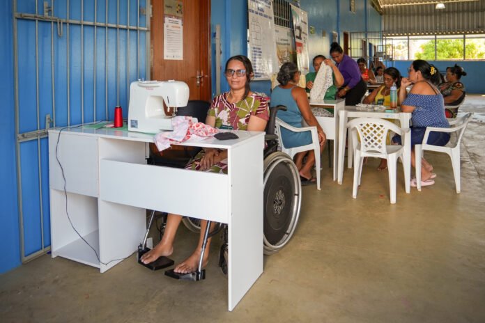Moradora do bairro Jatobá, Carla Souza é cadeirante e conta que o curso de Corte e Costura tem sido uma oportunidade de renda extra e de cuidado com a mente. “Costurar ajuda a ocupar a cabeça e ainda garantir um dinheiro a mais. É uma terapia mesmo. A costura me faz criar uma peça aqui, outra ali, e isso contribui muito para a minha saúde mental. Eu me sinto muito feliz”, compartilha.