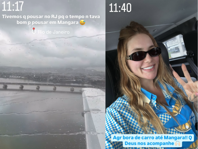 “Tivemos que pousar no Rio de Janeiro porque o tempo não estava bom para pousar em Mangaratiba”, escreveu ela, que em seguida completou: “Agora bora de carro até Mangaratiba. Que Deus nos acompanhe”, disse a influenciadora.