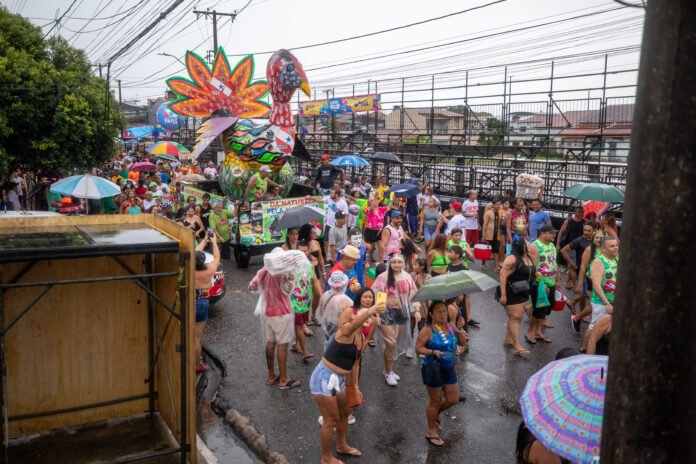 Alegria e a diversidade de brincantes marcaram o desfile do tradicional bloco Rabo do Peru, ontem, Quarta-feira de Cinzas, 5, no distrito de Icoaraci. A agremiação comemorou 30 anos de existência e trouxe como tema “Rabo do Peru na COP 30 – Da Natureza, pela Natureza e para a Natureza”. Uma multidão de foliões, estimada em 350 mil pessoas, mais do que no ano passado, percorreu em quatro horas os três quilômetros do corredor da folia, organizado pela Prefeitura de Belém, por meio da Subprefeitura local, na Rua 15 de Agosto.