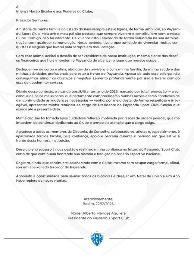 Na nota, o agora ex-presidente ressalta os 25 anos de trabalho voluntário na administração bicolor e explica que, mesmo dedicado “de corpo e alma” às funções, não conseguiu alcançar os objetivos traçados. Ele citou os desafios financeiros e esportivos como fatores que o motivaram a deixar o cargo, afirmando que sua saída abre caminho para uma renovação na gestão do clube visando a temporada de 2026.