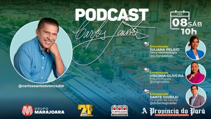 A onco hematologia, Juliana Pelaio, a pneumologista, Virginia Oliveira, e o cirurgião de coluna, Dante Giubilei, serão os convidados para participar do Podcast Carlos Santos neste sábado (8), às 10h da manhã, ao vivo, na rádio e TV, canal 50.1, e em todas as redes sociais do Grupo Marajoara.