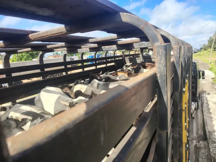 “O veículo transportava gado com nota fiscal datada de 22 de maio, mas que já havia sido registrada no sistema da Sefa no dia 23. Após solicitação de nova nota, foi emitido outro documento fiscal, desta vez informando apenas 45 animais. Na conferência física, foram encontradas 75 cabeças de gado, o que evidenciou a divergência”, relatou Gustavo Bozola, coordenador da unidade.