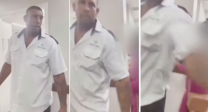 Durante uma discussão, o paciente saiu de dentro da sala e a filha o advertiu para que voltasse, pois estava com dor de cabeça. No fim da sequência, o segurança deu um tapa na mão da mulher.