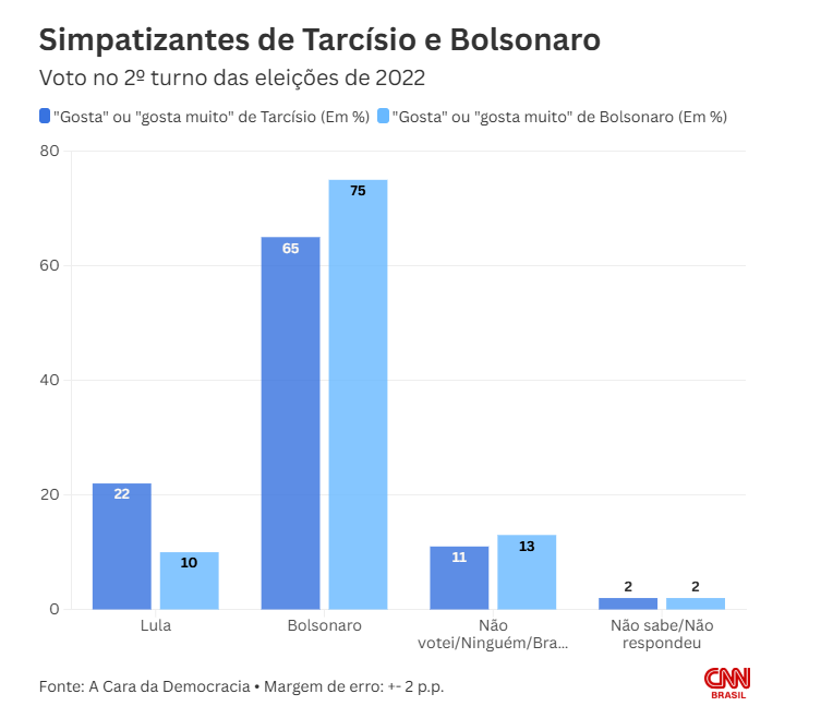 A margem de erro da pesquisa é de dois pontos percentuais, com 95% de confiança. Os dados analisados consideram os entrevistados que atribuíram notas de 7 a 10 em simpatia por Tarcísio (497 pessoas) e por Bolsonaro (739). Em subgrupos, a margem de erro é maior.