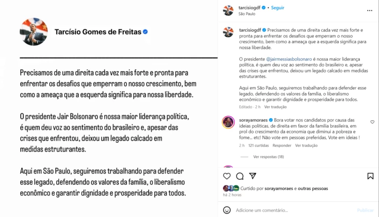 Nesse embate, Tarcísio aparece declarando que a direita deve estar forte para os próximos desafios e que o ex-presidente segue sendo a maior liderança política.