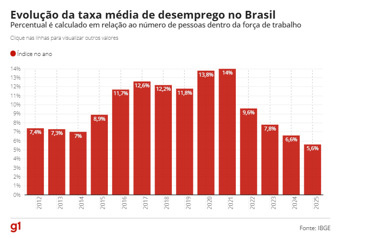 A taxa média anual de desocupação do Brasil ficou em 5,6% em 2025, o menor patamar desde o início da série histórica, em 2012. O índice recuou 1 ponto percentual em relação a 2024, quando estava em 6,6%.