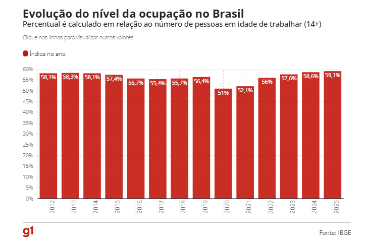 O nível de ocupação — proporção de pessoas ocupadas na população em idade de trabalhar — também atingiu recorde, ao chegar a 59,1% em 2025. O indicador avançou 0,5 ponto percentual em relação a 2024 (58,6%) e ficou acima do patamar observado em 2012, de 58,1%.