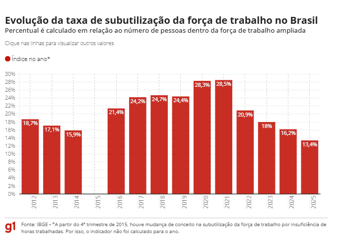 A taxa anual de subutilização da força de trabalho foi estimada em 14,5% em 2025, recuo de 1,7 ponto percentual frente a 2024, quando estava em 16,2%. O indicador havia sido de 24,4% em 2019, 15,8% em 2014 e 18,6% em 2012.