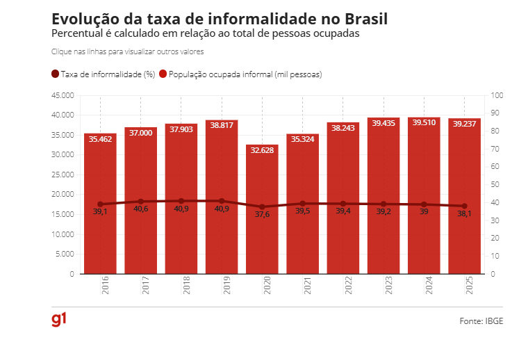 Em 2025, o número de trabalhadores domésticos recuou 4,4%, totalizando 5,6 milhões de pessoas. No mesmo período, a taxa anual de informalidade caiu de 39%, em 2024, para 38,1%, indicando uma leve melhora na estrutura do mercado de trabalho.