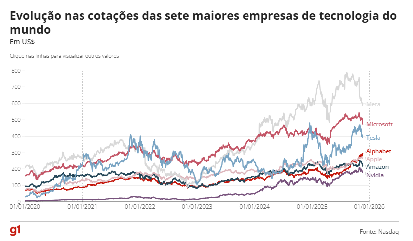 O valor conjunto dessas empresas caiu de US$ 22,24 trilhões em 29 de outubro para US$ 20,49 trilhões em 20 de novembro. Mesmo assim, no longo prazo, essas companhias seguem acumulando forte valorização.