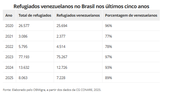 O Brasil concedeu status de refugiado a 164 mil pessoas entre 2019 e 2024, segundo dados do Comitê Nacional para os Refugiados (Conare). Desse total, os venezuelanos somam 148 mil casos, o que consolida a prevalência do grupo nas estatísticas migratórias do país.