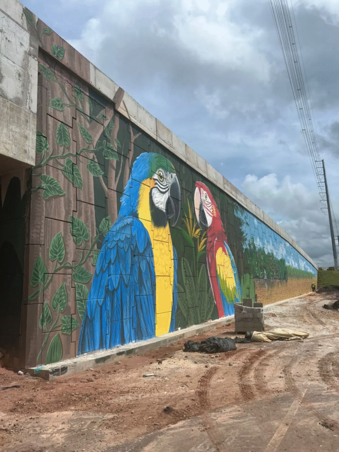 Além da melhoria na mobilidade, o viaduto também ganhou um toque artístico especial. Os muros receberam uma intervenção do muralista paraense Jeferson Cardoso, que retratou elementos da biodiversidade amazônica, como araras e guarás, em tons vivos e vibrantes. A pintura, feita à mão livre, é uma homenagem à natureza da região. “É uma alegria grande proporcionar para a população uma pintura tão linda”, disse o artista.